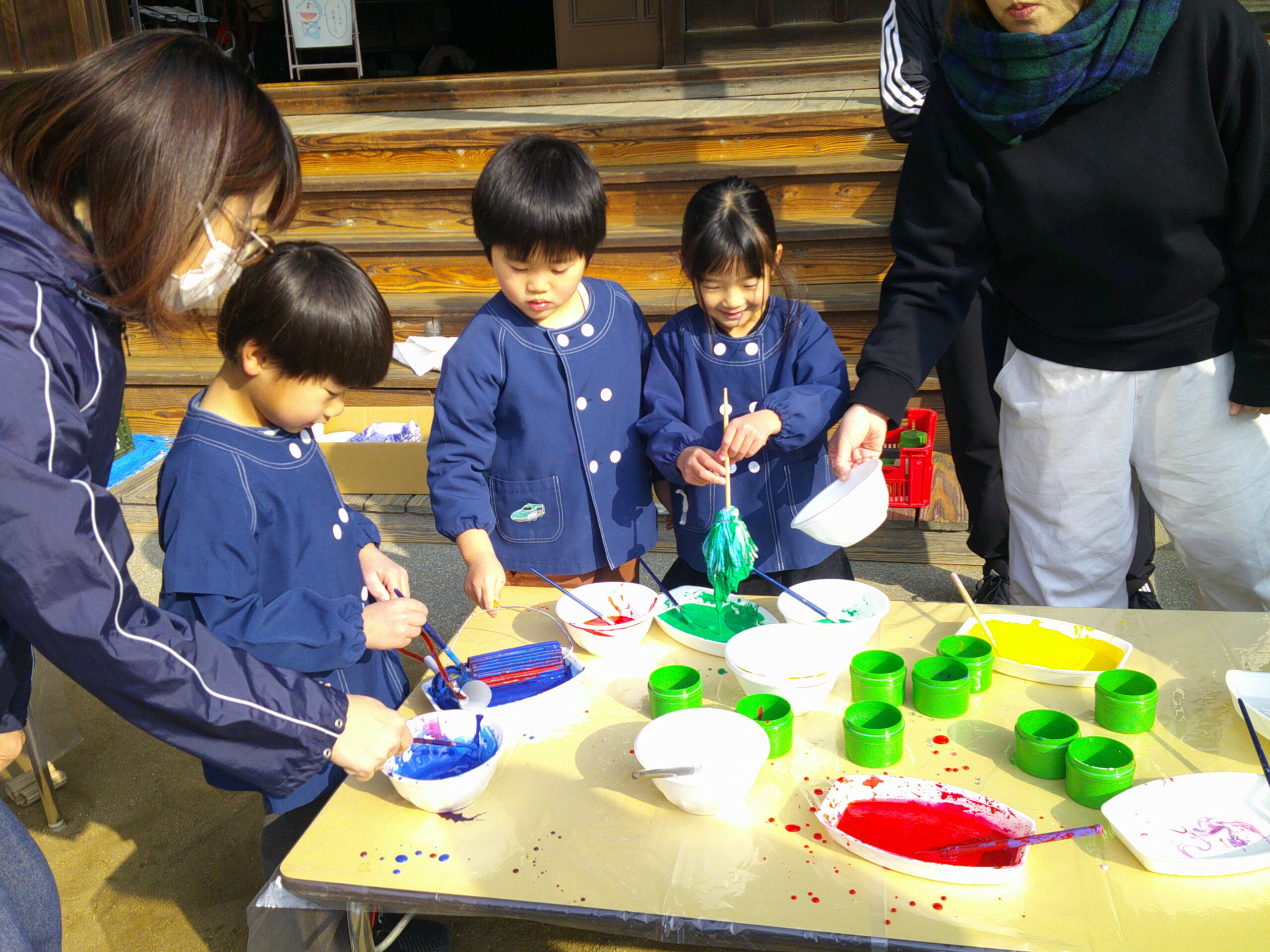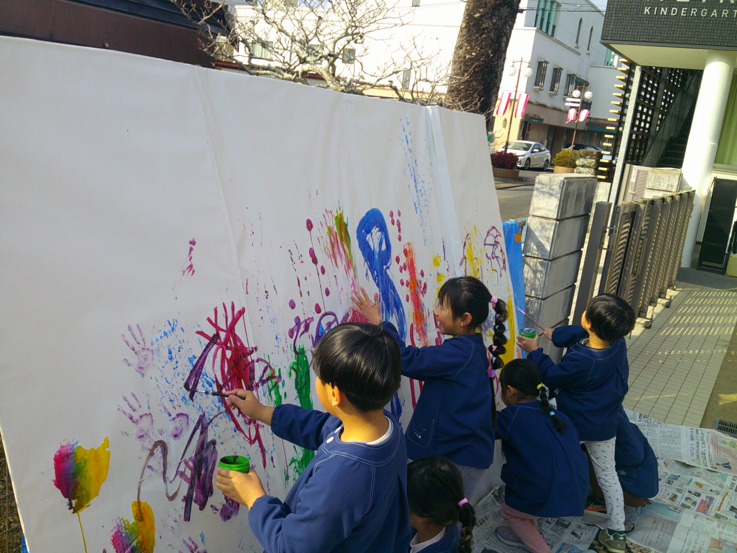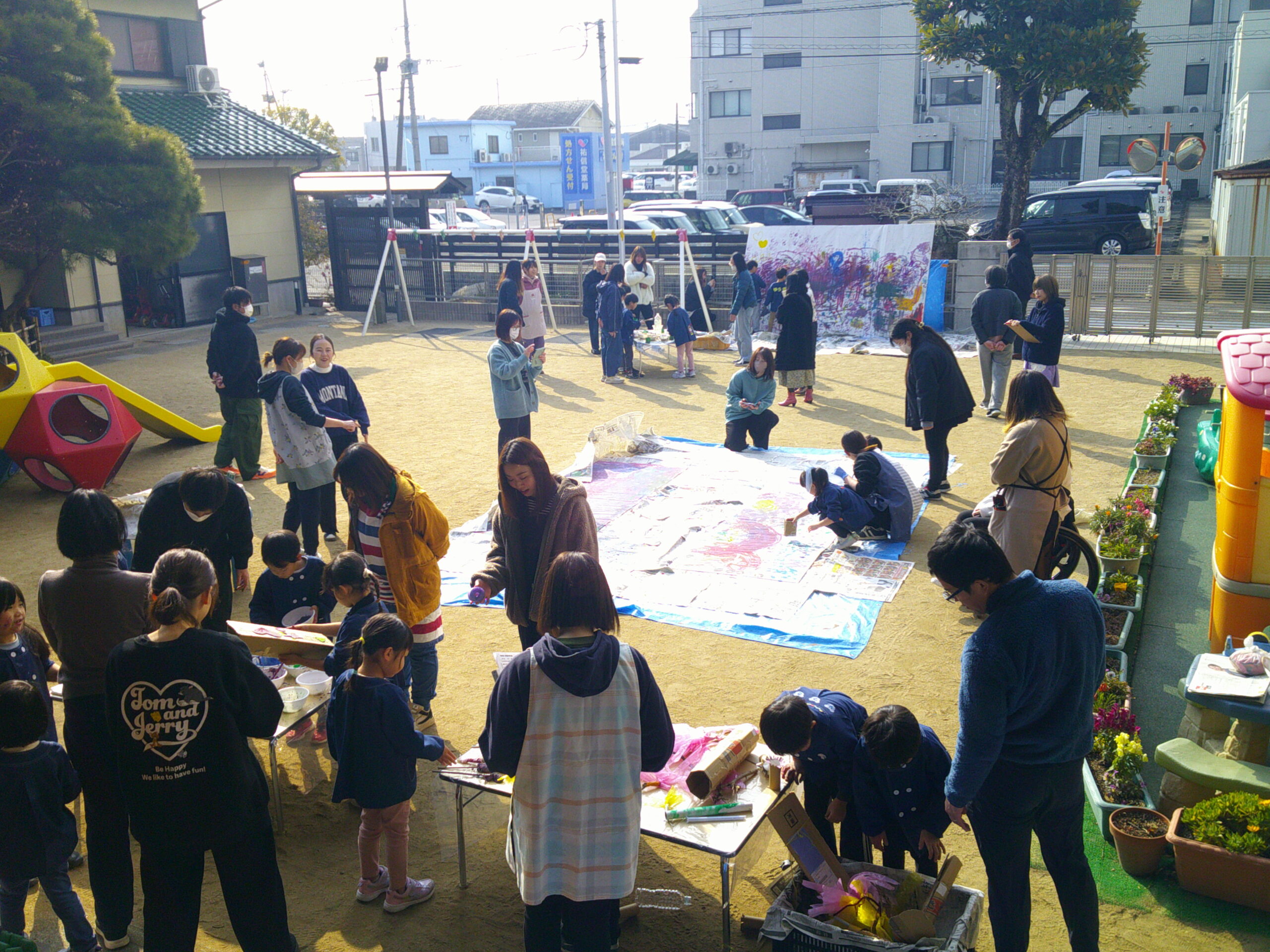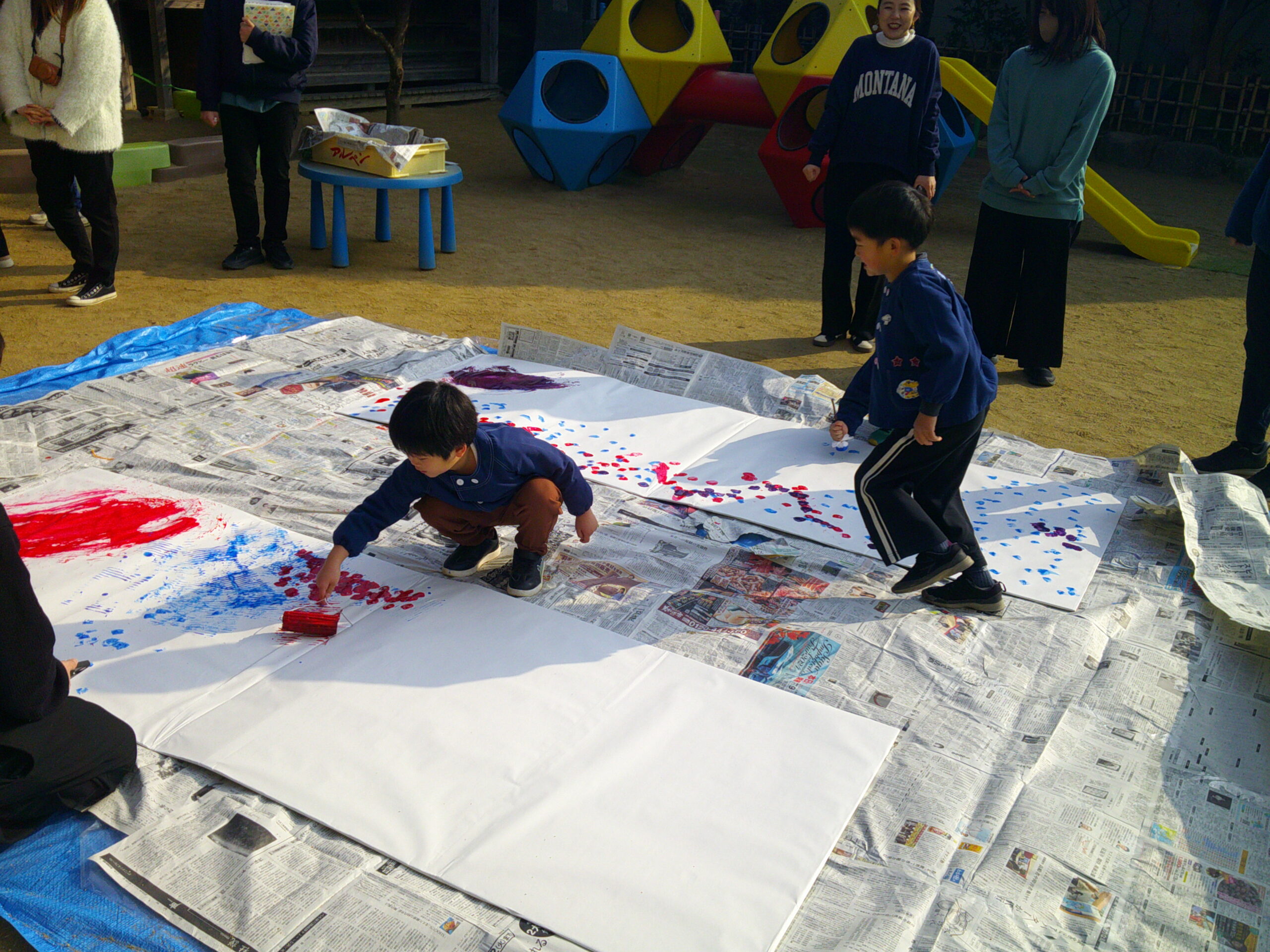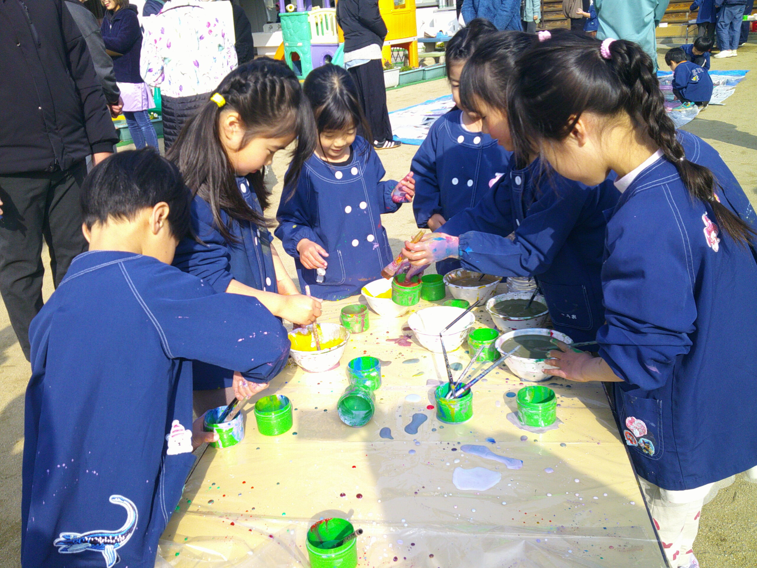 お部屋ではできない絵具遊びを、体いっぱい動かしておうちの人と一緒にみんなで楽しみました。
